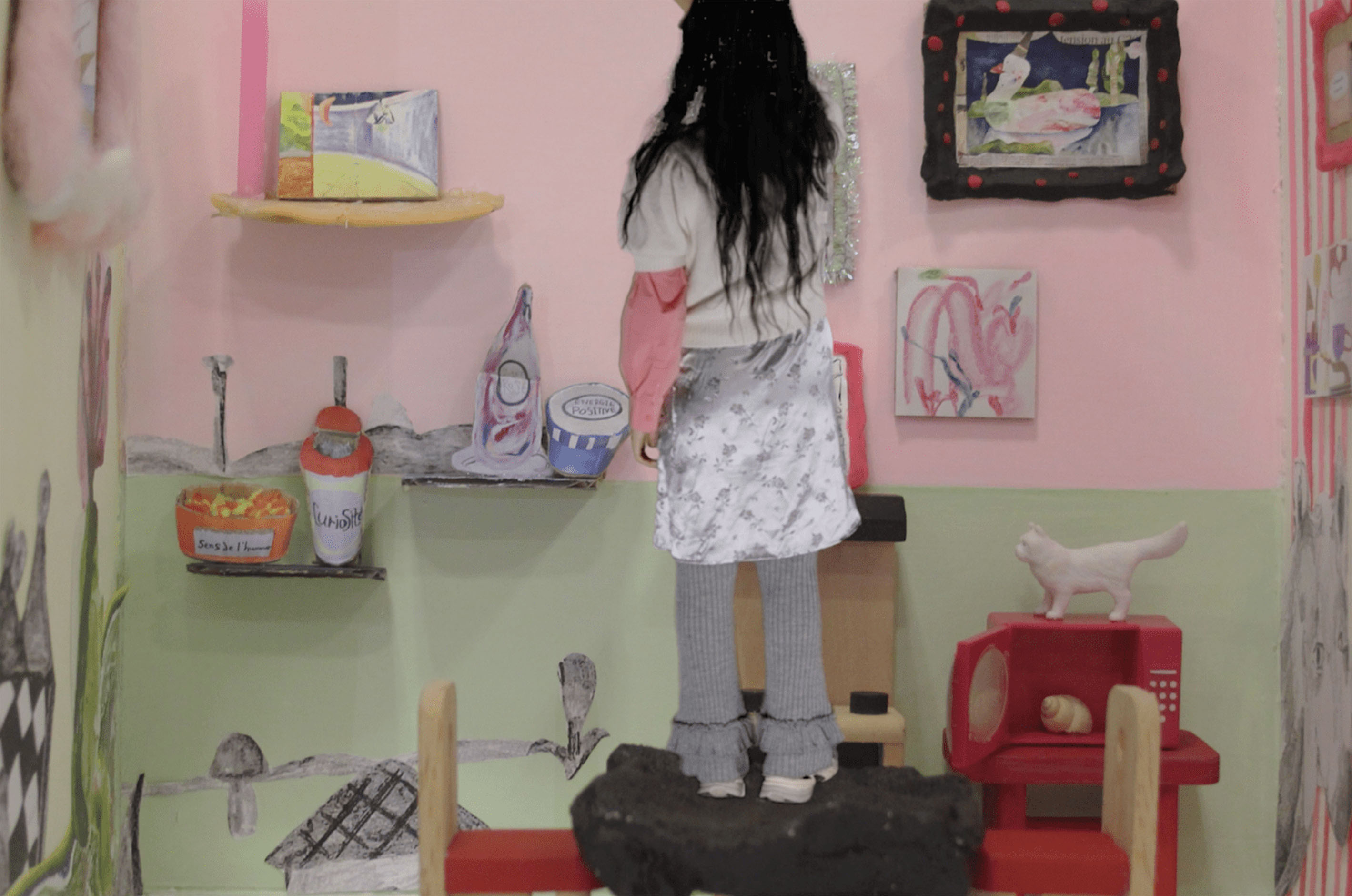An ordinary day in my bedroom. This film explores the identity of an artist in a common place. The two « I » dialogues in French and Korean, and ask the following question : « How does the ordinary become art ? » Actions and emotions apparently insignificant leave artistic traces in every room. The room is not only a space but a mirror where daily life and art collide and harmonize themselves, and a scene where I can communicate with myself. This film displays that art consists of finding the extraordinary in the ordinary and being in dialogue with ourselves.